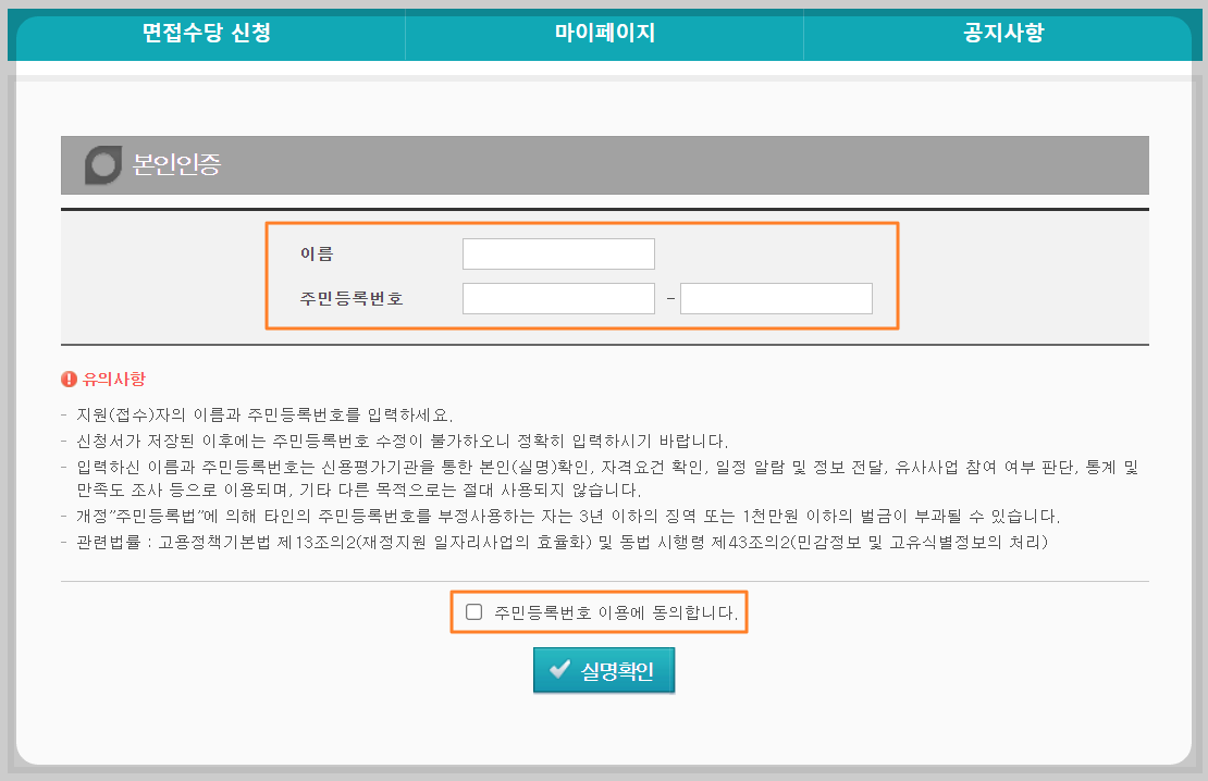 다시 첫화면에서 '면접수당 신청'을 누르면 본인인증을 하라는 창이 뜹니다. 본인인증을 완료합니다.