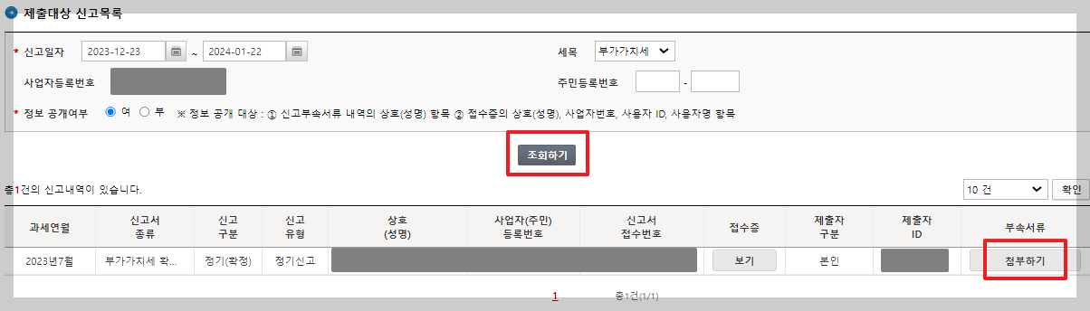 부가가치세 신고 화면입니다. 사업자등록번호 우측에 있는 [확인] 버튼을 누르면 웬만한 정보가 자동으로 채워집니다.