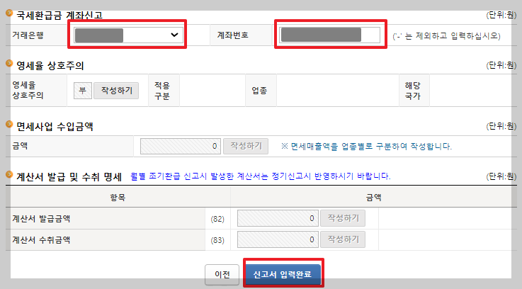 환급금을 입금받을 계좌번호를 입력해야 합니다. '국세환급금 계좌신고' 항목에서 환급금을 지급받을 계좌번호를 입력한 후, 맨 아래의 [신고서 입력완료]를 누릅니다. 지금까지 작성해 둔 것을 잘 저장해 두었으면 이제 증빙서류를 제출합니다.